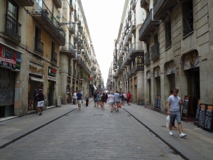ここは、Carrer de Ferran(フェラン通り)といいます。通り名を確認するには、道の一番端の建物の高いところにこのような標識が付いているので見てみてください。