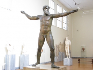 アルテミシオン沖で発掘された、海を司る神・ポセイドンの青銅像。鍛え上げられた肉体が美しく、彼の武器である三叉の矛を手に持っている様子が目に浮かびます。