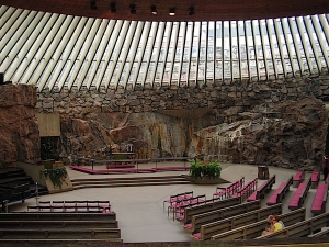 1969年にスオマライネン兄弟の設計により、大岩を掘り下げて作られた世界でも大変珍しいフィンランド福音ルター派の教会。この教会は円形状で、屋根には大きな青銅のドームを乗せ、壁は掘り出したままの岩をむき出しにしています。壁上部にはガラス窓がたっぷりとはめ込まれており、自然光が美しく差し込み、幻想的で神聖な世界を演出しています。また、岩壁は音響効果に大変優れており、コンサート場としても頻繁に使用されます。