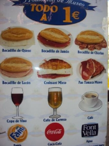 マドリッド市内に複数展開しているMuseo del Jamon(ハムの博物館)。美味しい生ハムをリーズナブルな価格で楽しめちゃいます!ビールが7セント、サンドイッチは1ユーロ、生ハムも1皿2.5ユーロととっても良心的。ソフトドリンクもありますので、お酒が飲めなくても安心です。