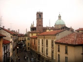 この塔はもともと1198年に町のシンボルとして建てられて、15世紀後半に建築家ブラマンテが作った設計のもとで現在の高さ(おおよそ56メートル)まで高められました。のちにミラノにあるスフォルツェスコ城のフィラレ-テの塔のモデルとなったと言われています。