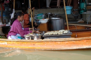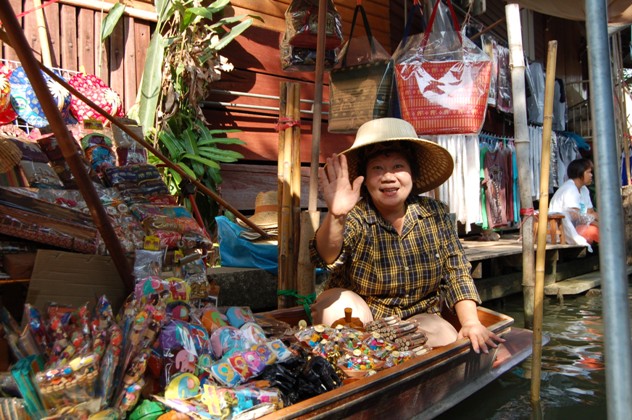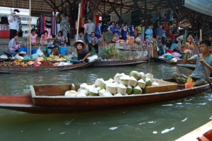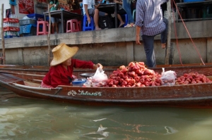 市場が最も活況を呈するのは朝の8時から10時頃までの早い時間帯であり、地元の人と観光客で水路は船が渋滞するほど込み合います。