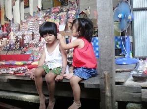 水路脇には民家が立ち並び、殆どの家屋が舟を所有しています。この家屋で商品、すなわち食料品や果実を用意し、そのまま舟で水路を移動、お客の集まる市場まで向かいます。